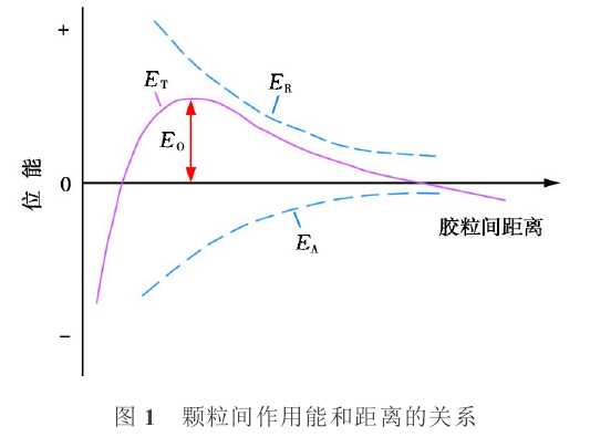 從圖1可以看出,當(dāng)兩個(gè)顆粒相距較遠(yuǎn)時(shí),離子氛尚未重疊,粒子間“遠(yuǎn)距離”的吸引力在起作用,即引力占優(yōu)勢(shì),曲線在橫軸以下,總位能為負(fù)值。隨著顆粒間距離變近,離子氛重疊,斥力開(kāi)始起作用,總位能逐漸上升為正值。至一定距離處,總位能最大,出現(xiàn)一個(gè)位能峰EO。當(dāng)越過(guò)位能峰EO時(shí),位能迅速下降,說(shuō)明當(dāng)顆粒距離很近時(shí),吸引能EA隨著顆粒之間距離的變小而激增,使引力占優(yōu)勢(shì),總位能下降為負(fù)值,意味著顆粒將發(fā)生團(tuán)聚[5]。