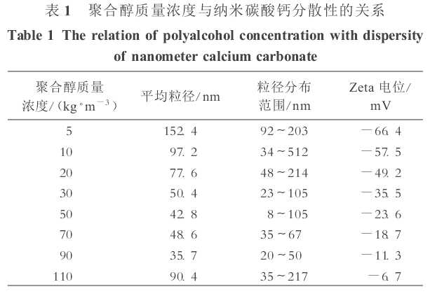 溶液中含有適量的- OH對(duì)納米碳酸鈣的分散有促進(jìn)作用。在轉(zhuǎn)速為8 000 r/min時(shí),采用聚合醇SD-301作為分散劑,測(cè)定了納米材料的分散粒徑,實(shí)驗(yàn)結(jié)果如表1所示。