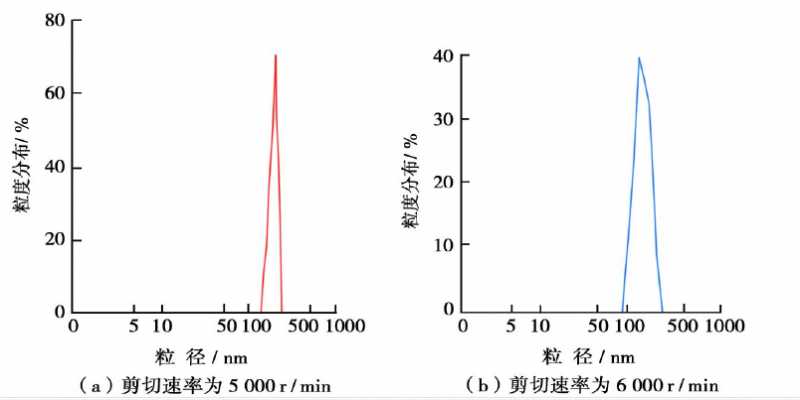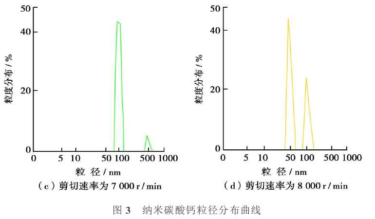 納米顆粒在介質(zhì)中的分散過(guò)程一般分為3個(gè)步驟[7]:①納米顆粒在介質(zhì)中的潤(rùn)濕;②利用機(jī)械力打開(kāi)團(tuán)聚體[8];③穩(wěn)定已分散的顆粒。利用Zetasizer3000型膠體顆粒度/電位測(cè)試儀測(cè)定了在不同剪切速度下納米碳酸鈣粒度分布特征(圖3)。單純采用高速攪拌,轉(zhuǎn)速需要達(dá)到5000 r/min以上,利用攪拌機(jī)強(qiáng)大的剪切力才能把納米碳酸鈣均勻分散在水介質(zhì)中。隨著攪拌速度的提高,納米碳酸鈣平均粒徑減少,但溶液不具備穩(wěn)定性,靜置后分層。