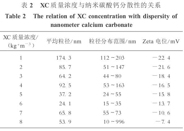 從表1可以看出,聚合醇SD-301加量增加,納米碳酸鈣在水中的分散粒徑逐漸減小。當(dāng)質(zhì)量濃度增加到90kg/m3時(shí),粒徑平均值最小為35. 7nm,且分布范圍較窄(20~ 50nm);聚合醇SD-301質(zhì)量濃度繼續(xù)增加時(shí),納米材料的平均粒徑明顯增加,分布范圍也明顯變寬。因此,聚合醇SD-301質(zhì)量濃度為90 kg/m3是改進(jìn)納米碳酸鈣水溶液分散性的最佳值。從表1還可以明顯看出,SD-301主要是起空間位阻的作用,靜電作用不明顯。