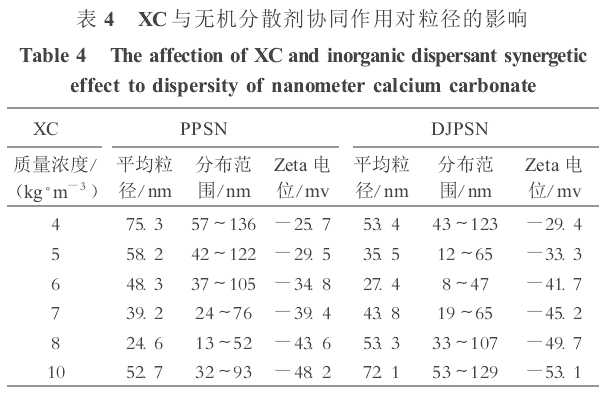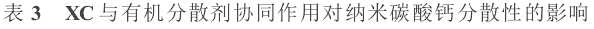 實(shí)驗(yàn)發(fā)現(xiàn),如果將兩類(lèi)分散劑按一定的比例復(fù)配使用,分散效果顯著提高。采用聚陰離子型纖維物PPH和XC結(jié)合,考察了納米碳酸鈣的分散性,實(shí)驗(yàn)結(jié)果如表3所示。