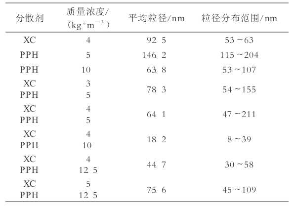 由實(shí)驗(yàn)結(jié)果可以看出,當(dāng)XC質(zhì)量濃度為4 kg/m3時(shí),納米顆粒在水介質(zhì)中的平均粒徑約為92. 5nm,溶液為白色乳狀,處于穩(wěn)定狀態(tài);當(dāng)PPH質(zhì)量濃度為10 kg/m3時(shí),納米顆粒的分散平均粒徑為63. 8nm,溶液靜置分層。當(dāng)兩種物質(zhì)混合時(shí),在相同質(zhì)量濃度下,納米顆粒的粒徑分散范圍降至8~ 39 nm。由此可以看出,XC與PPH混合充分發(fā)揮了分散劑的協(xié)同作用,取得了較好的效果。