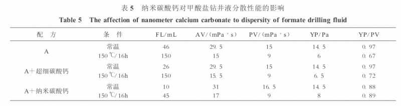 進(jìn)行了評(píng)價(jià)納米碳酸鈣對(duì)鉆井液分散性能實(shí)驗(yàn)。實(shí)驗(yàn)漿A配方為:1. 15 g/cm3的甲酸鹽溶液+ 6 kg/m3XC+ 5kg/m3 NS,再分別加入5kg/m3的超細(xì)碳酸鈣和5kg/m3的納米碳酸鈣,實(shí)驗(yàn)結(jié)果見(jiàn)表5。