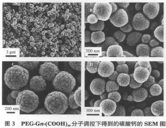 水溶性大分子是一種親水性的高分子材料, 在水中能溶解或溶脹而形成溶液或分散液. 它具有性能優(yōu)異、使用方便、有利于環(huán)境保護(hù)等優(yōu)點(diǎn), 廣泛應(yīng)用于國(guó)民經(jīng)濟(jì)的各個(gè)領(lǐng)域[45]. 水溶性大分子通過吸附在晶體表面提供結(jié)晶點(diǎn), 降低成核能, 從而調(diào)控晶體的成核、生長(zhǎng)和形貌. 同時(shí), 水溶性大分子可以通過分子設(shè)計(jì)及優(yōu)化等使其在水溶液中對(duì)礦物表面有選擇性吸附或自組裝成不同結(jié)構(gòu)的聚集體. 所以, 用水溶性大分子調(diào)控碳酸鈣合成的研究頗多[46-65]. 本文結(jié)合本課題組的工作綜述了近年來水溶性大分子對(duì)碳酸鈣結(jié)晶的調(diào)控作用, 以期為具有不同特性碳酸鈣的合成和應(yīng)用提供幫助.