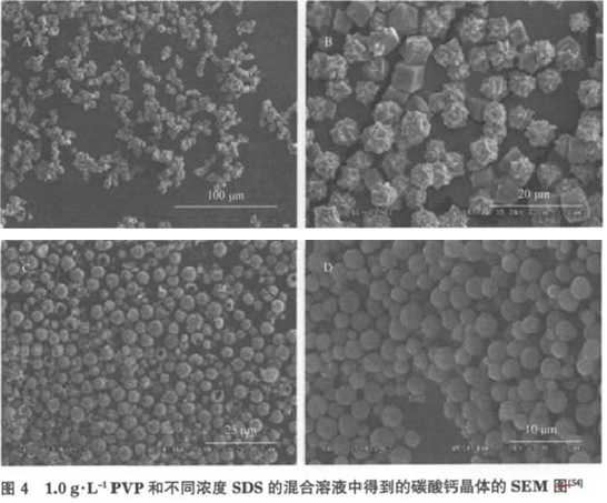 通過大分子與表面活性劑的相互作用調(diào)控微納米材料的合成早已引起人們的重視[121-126]. 以大分子/表面活性劑混合體系為模板合成的碳酸鈣, 其形貌也不同于單一的大分子或表面活性劑調(diào)控時(shí)得到的晶體形貌[53,54,63,127,128]. 我們以聚乙烯吡咯烷酮(PVP)/十二烷基硫酸鈉(SDS)、十二烷基磺酸鈉(AS)、十二烷基苯磺酸鈉(SDBS)混合體系為模板合成了多種形貌和晶型的碳酸鈣晶體[52-54,129]. 研究結(jié)果表明, 大分子濃度一定時(shí), 碳酸鈣的形貌和晶型隨表面活性劑濃度的變化而變化. 例如, 將 Ca Cl2溶液快速加入PVP(1.0 g·L-1)/SDS/Na2CO3溶液中, SDS 濃度分別為 2.5×10-4、1.0×10-3、5.0×10-3 和 5.0×10-2 mol·L-1時(shí), 得到的碳酸鈣晶體分別為六面體狀方解石、花狀方解石、中空的球形方解石和球形球霰石(如圖 4 所示)[54]. 表面活性劑濃度一定時(shí), 大分子的濃度也對(duì)碳酸鈣的形貌有顯著影響.大分子/表面活性劑混合體系對(duì)碳酸鈣結(jié)晶的調(diào)控作用不同于單一體系的原因是兩者發(fā)生了相互作用. 通常, 水溶液中表面活性劑與大分子之間通過疏水相互作用形成大分子/表面活性劑“復(fù)合物”, 即當(dāng)表面活性劑濃度達(dá)到臨界聚集濃度時(shí), 表面活性劑分子可“吸附”在大分子鏈上; 表面活性劑在大分子鏈上“吸附”飽和后, 繼續(xù)增加表面活性劑, 體系中又形成自由膠束[130]復(fù)合物, 自由膠束的存在改變了僅含有大分子時(shí)的模板作用, 所以, 大分子濃度一定時(shí), 隨體系中表面活性劑濃度的增加, 晶體的形貌發(fā)生明顯變化. 有時(shí)表面活性劑/大分子可能以協(xié)同方式吸附于碳酸鈣晶體的表面, 抑制或促進(jìn)晶體的生長(zhǎng). 表面活性劑的存在也可能導(dǎo)致大分子的聚集行為改變, 進(jìn)而促進(jìn)或抑制碳酸鈣的結(jié)晶作用. 如在堿性條件下, PEG-b-PMAA 不能形成膠束[131], 但是少量 SDS 的加入可以誘導(dǎo)形成 PEO-b-PMAA/SDS 核殼狀膠束, SDS-PEO 為膠束的內(nèi)核, PMAA 伸向水相構(gòu)成膠束的冠狀結(jié)構(gòu)作為球狀碳酸鈣的模板.SDS 濃度增大時(shí), 其在水溶液中形成膠束, PEO-b-PMAA 因與 SDS 間的離子-偶極作用而吸附在膠束表面, 促進(jìn)圓盤狀球霰石的形成. 靜置時(shí)間延長(zhǎng), 圓盤狀聚集體中間處 SDS 溶解導(dǎo)致圓盤狀球霰石空心結(jié)構(gòu)形成[62]. 另外, 郭靜等[132]發(fā)現(xiàn)(EO)20-(PO)70-(EO)20與 SDS 形成的混合膠束可以調(diào)控合成由方解石和球霰石構(gòu)成的球形聚集體; 而 Yu 等[133]用聚苯乙烯-馬來酸(PS-MA)/CTAB 為模板則合成出由方解石和球霰石構(gòu)成的空心球狀和花生狀聚集體; Donners等[134]在聚丙烯亞胺支狀大分子/SDS(CTAB,十八胺(OA))體系中制得了球形球霰石. 這些結(jié)果進(jìn)一步證明, 當(dāng)體系中含有表面活性劑時(shí), 大分子對(duì)碳酸鈣結(jié)晶的影響依賴于它與表面活性劑的相互作用. 顯然,掌握大分子與表面活性劑的相互作用對(duì)于生物礦化具有重要意義, 因?yàn)樯矬w系中蛋白質(zhì)、多糖和纖維素等大分子常常與表面活性物質(zhì)共存.