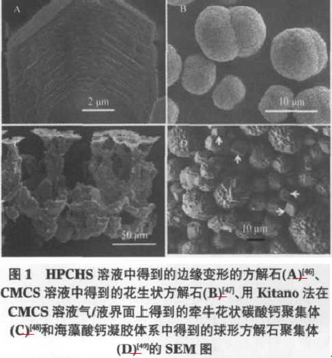 生物大分子因在生物礦化中的神奇作用而被廣泛用于模擬礦化研究. 常用的生物大分子有蛋白質(zhì)[28,58,60,66-71]、聚氨基酸[34,70]和多糖[21,46-50,59,72-74]等. 如聚-L-絲氨酸-磷酸-L-門冬氨酸誘導(dǎo)合成順時(shí)針螺旋的帶狀方解石, 而聚-D-絲氨酸-磷酸-D-門冬氨酸誘導(dǎo)合成逆時(shí)針螺旋的帶狀方解石[75]; 聚門冬氨酸誘導(dǎo)形成由納米粒子聚集成的球狀霰石聚集體[34]. 生物大分子對(duì)晶體不同形貌和晶型的調(diào)控作用可以用C觟lfen 等[76-77]提出的以粒子為基礎(chǔ)的生長(zhǎng)機(jī)理來解釋.不同結(jié)構(gòu)的生物大分子誘導(dǎo)形成不同形貌和晶型的碳酸鈣, 如從禽蛋中提取的蛋白溶菌酶[67,69]和從豬膽汁中提取的膽汁蛋白[78]均有利于方解石的形成. 從紫貽貝中提取的蛋白質(zhì)(OMM)能促進(jìn)方解石和球霰石的成核過程, 但是明顯抑制它們的生長(zhǎng)[70],在低質(zhì)量的淡水珍珠中也存在大量球霰石[13,79]. 從受傷貝殼中提取的蛋白質(zhì)(HDS)有利于文石結(jié)晶和生長(zhǎng), 而且文石的生長(zhǎng)速率是普通方解石生長(zhǎng)速率的67 倍[68]. 對(duì) HDS 二級(jí)結(jié)構(gòu)分析發(fā)現(xiàn), 其中含有 83%的甘氨酸, 這些氨基酸一方面通過靜電作用結(jié)合Ca2+, 提供結(jié)晶點(diǎn)、降低成核能, 進(jìn)而促進(jìn)碳酸鈣晶核的形成; 另一方面, 在水溶液中排列成一定幾何構(gòu)型從而促進(jìn)正斜方晶結(jié)構(gòu)文石的生長(zhǎng)[68,79].聚門冬氨酸抑制碳酸鈣結(jié)晶和生長(zhǎng)的效果明顯好于水解聚馬來酸酐和磺酸鹽共聚物, 但是略遜于聚門冬氨酸衍生物的作用[80-81]. 與聚門冬氨酸相比,聚門冬氨酸/谷氨酸共聚物對(duì)碳酸鈣的結(jié)晶和生長(zhǎng)的抑制效果更好, 其抑制效率與傳統(tǒng)的含磷阻垢劑(EDTMPS 和 ATMP)的相當(dāng)[82]. 后者通過膦氧基和羧基兩個(gè)功能基團(tuán)在碳酸鈣晶體表面的吸附抑制其生長(zhǎng)[83].生物礦物在生物體內(nèi)的形成不僅與蛋白質(zhì)密切相關(guān), 與生物多糖也密切相關(guān). 多糖是指醛糖和酮糖通過糖苷鍵連接在一起的大分子, 廣泛存在于動(dòng)物、植物以及微生物體內(nèi), 是構(gòu)成生物體的一類十分重要的物質(zhì), 如動(dòng)物體內(nèi)的肝糖元、甲殼素, 軟體動(dòng)物的外殼主要是多糖. 多糖廣泛參與動(dòng)植物體內(nèi)的礦化過程, 礦物與多糖的相互作用使得其前驅(qū)體在多糖模板上有很好的取向[84].殼聚糖以羥基化多糖、羧基化多糖、硫酸化多糖等形式大量存在于生物體內(nèi), 在生物礦化過程中起到很重要的作用. 有些通過功能基團(tuán)和 Ca2+間的靜電相互作用以及功能基團(tuán)和碳酸鈣晶體間的幾何匹配和自身立體化學(xué)構(gòu)型等方式調(diào)控碳酸鈣的形貌和晶型[9,20]. 我們的研究發(fā)現(xiàn), 羥基異丙基殼聚糖(HPCHS)通過羥基和氨基在碳酸鈣晶體表面和邊緣的吸附,抑制其生長(zhǎng)(圖 1A)[46]; 向羧甲基殼聚糖(CMCS)/Ca Cl2混合溶液和(2-羥基-3-丁氧基)丙基羧甲基殼聚糖/Ca Cl2混合溶液中直接加入 Na2CO3溶液, 可以調(diào)控得到花生狀方解石(圖 1B)[47]; 利用 Kitano 法, 在CMCS 溶液的氣/液界面上得到牽牛花狀碳酸鈣聚集體(圖 1C), 且碳酸鈣的晶型隨 CMCS 濃度的變化而變化[48]; 若用氣體擴(kuò)散法, 在 Ca2+誘導(dǎo)海藻酸鈉形成的海藻酸鈣凝膠體系中則得到由六面體狀方解石構(gòu)成的球形聚集體(圖 1D)[49], 聚集體的形貌隨凝膠體系組成的變化而變化. 帶羧基的殼聚糖對(duì)碳酸鈣的影響比較復(fù)雜, 一方面, 羧酸根離子與 Ca2+發(fā)生靜電相互作用降低界面能和成核能, 其中的 Ca2+作為碳酸鈣的結(jié)晶點(diǎn)和鈣源, 促進(jìn)晶體形成; 另一方面,晶體成核后殼聚糖通過羧酸根離子吸附在晶體表面抑制其向更穩(wěn)定晶型轉(zhuǎn)變和生長(zhǎng)[47-48,50]. 此類研究在一定程度上模擬了無脊椎動(dòng)物富集 Ca2+、CO2-3及其礦化的過程[49]. 牽?;罹奂w和球形聚集體的形成過程中, 除羧酸根離子與 Ca2+的靜電相互作用外,CO2氣泡也起重要作用. 這些研究表明, 碳酸鈣的結(jié)晶和生長(zhǎng)不僅依賴于大分子調(diào)控劑, 而且與制備方法和過程密切相關(guān).根據(jù)晶體生長(zhǎng)規(guī)律[71], 晶體曲面的生長(zhǎng)速率最快, 階梯面次之, 平面最慢, 晶體最初的階梯面和曲面決定其最終形貌. 大分子濃度很低時(shí), 它們優(yōu)先吸附在曲面和階梯面上, 降低這些面的生長(zhǎng)速率; 平面的相對(duì)生長(zhǎng)速率高于曲面和階梯面, 導(dǎo)致了多層狀晶體的形成. 大分子濃度增加, 曲面和階梯面不足以負(fù)擔(dān)更多的大分子, 于是大分子開始吸附在平面上, 并聚集在一些晶體的間隙里, 從而形成球狀聚集體[13]