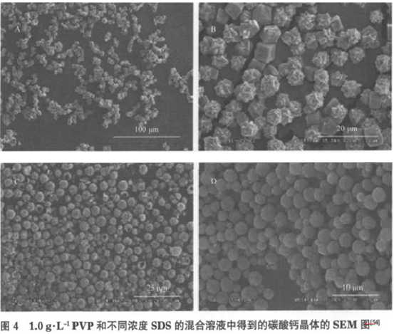 通過大分子與表面活性劑的相互作用調(diào)控微納米材料的合成早已引起人們的重視[121-126]. 以大分子/表面活性劑混合體系為模板合成的碳酸鈣, 其形貌也不同于單一的大分子或表面活性劑調(diào)控時(shí)得到的晶體形貌[53,54,63,127,128]. 我們以聚乙烯吡咯烷酮(PVP)/十二烷基硫酸鈉(SDS)、十二烷基磺酸鈉(AS)、十二烷基苯磺酸鈉(SDBS)混合體系為模板合成了多種形貌和晶型的碳酸鈣晶體[52-54,129]. 研究結(jié)果表明, 大分子濃度一定時(shí), 碳酸鈣的形貌和晶型隨表面活性劑濃度的變化而變化. 例如, 將 Ca Cl2溶液快速加入PVP(1.0 g•L-1)/SDS/Na2CO3溶液中, SDS 濃度分別為 2.5×10-4、1.0×10-3、5.0×10-3 和 5.0×10-2 mol•L-1時(shí), 得到的碳酸鈣晶體分別為六面體狀方解石、花狀方解石、中空的球形方解石和球形球霰石(如圖 4 所示)[54]. 表面活性劑濃度一定時(shí), 大分子的濃度也對(duì)碳酸鈣的形貌有顯著影響.大分子/表面活性劑混合體系對(duì)碳酸鈣結(jié)晶的調(diào)控作用不同于單一體系的原因是兩者發(fā)生了相互作用. 通常, 水溶液中表面活性劑與大分子之間通過疏水相互作用形成大分子/表面活性劑“復(fù)合物”, 即當(dāng)表面活性劑濃度達(dá)到臨界聚集濃度時(shí), 表面活性劑分子可“吸附”在大分子鏈上; 表面活性劑在大分子鏈上“吸附”飽和后, 繼續(xù)增加表面活性劑, 體系中又形成自由膠束[130]復(fù)合物, 自由膠束的存在改變了僅含有大分子時(shí)的模板作用, 所以, 大分子濃度一定時(shí), 隨體系中表面活性劑濃度的增加, 晶體的形貌發(fā)生明顯變化. 有時(shí)表面活性劑/大分子可能以協(xié)同方式吸附于碳酸鈣晶體的表面, 抑制或促進(jìn)晶體的生長(zhǎng).