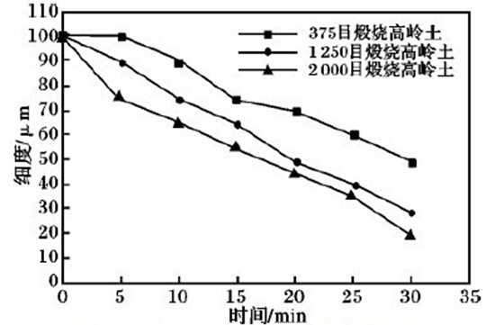 圖1 不同粒徑煅燒高嶺土配置的顏料漿液細(xì)度隨分散時(shí)間的變化