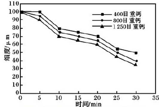圖2 不同粒徑重鈣配置的顏料漿液細(xì)度隨分散時(shí)間的變化
