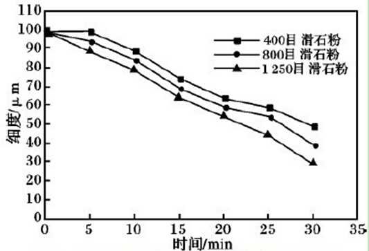 圖3 不同粒徑滑石粉配置的顏料漿液細(xì)度隨分散時(shí)間的變化