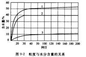物料的含水量與粒度的大小有很大關系。細粒物料較粗粒物料含水大,一方面因為表面水分的含量與表面積大小有關,物料粒度越細,其表面積越大,吸附的水分越多,所以表面水分含量越高。另一方面是細粒物料有大量的細小的毛細孔隙,毛細管作用顯著,因此較細料含有較多的水分。