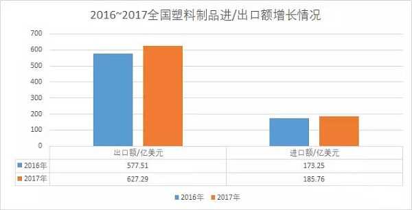 2017年,我國(guó)外貿(mào)回穩(wěn)向好的基礎(chǔ)不斷鞏固,發(fā)展?jié)摿φ鸩降玫结尫?,推?dòng)我國(guó)塑料制品行業(yè)進(jìn)出口持續(xù)增長(zhǎng)。全國(guó)塑料制品行業(yè)累計(jì)出口額627.29億美元,同比增長(zhǎng)8.62%,占輕工行業(yè)出口額的10.46%;進(jìn)口額185.76億美元,同比增長(zhǎng)7.22%,占輕工行業(yè)進(jìn)口額的11.42%;進(jìn)出口總值813.05億美元,貿(mào)易順差441.53億美元。在政策利好推動(dòng)下,優(yōu)勢(shì)企業(yè)紛紛“走出去”,在國(guó)外特別是“一帶一路”國(guó)家辦廠,拓展新市場(chǎng),如金發(fā)科技股份有限公司、廣東聯(lián)塑科技有限公司等公司紛紛到印度等國(guó)辦廠。