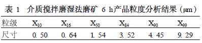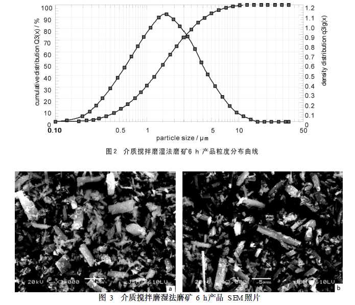表1為介質(zhì)攪拌磨濕法磨礦6h產(chǎn)品粒度分析結果,圖2為介質(zhì)攪拌磨濕法磨礦6h產(chǎn)品粒度分布曲線;圖3 ( a、b)為介質(zhì)攪拌磨濕法磨礦6h產(chǎn)品掃描電鏡照片。