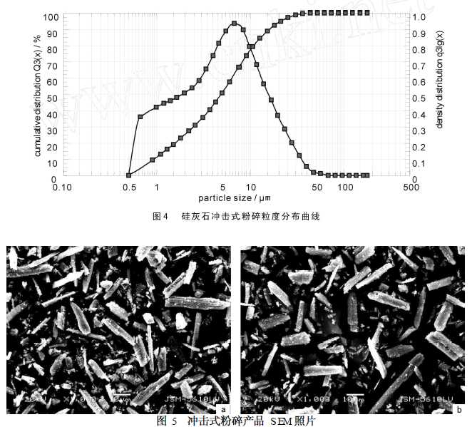 硅灰石試驗原料經(jīng)給料斗給入CM - 51型沖擊式超細粉碎機的粉碎腔內(nèi),在粉碎腔內(nèi)經(jīng)過兩級粉碎后由尾部安裝的風扇式輸送機送至渦輪分級機內(nèi),其中微細顆粒隨氣流一起通過高速旋轉(zhuǎn)的分級機葉片間隙進入到收塵器中,通過固氣分離,超細產(chǎn)品從收塵器底部排出,凈化的空氣經(jīng)高壓風機排入大氣。在分級機中,達不到粒度要求的大顆粒物料被高速旋轉(zhuǎn)的分級機葉輪打到分級筒的邊緣,并在邊緣沿螺旋線軌跡下落,經(jīng)旋轉(zhuǎn)閥門返回到粉碎腔進行再粉碎。表2 為沖擊式粉碎產(chǎn)品粒度分析結果;圖4為沖擊式粉碎產(chǎn)品粒度分布曲線;圖5為沖擊式粉碎產(chǎn)品SEM照片。