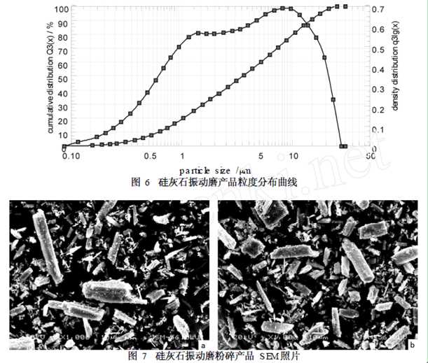 振動磨機工作時,筒體內(nèi)的物料隨著研磨介質(zhì)一起運動,它不斷受到研磨介質(zhì)強烈的沖擊、剪切和研磨,物料在這些力的作用下不斷細化。同時在振頻和振幅的作用下產(chǎn)生自轉(zhuǎn)和公轉(zhuǎn),不斷沿圓周做螺旋運動使物料位移直到出料口。這個過程中物料不僅產(chǎn)生分布混合,還上下剪切產(chǎn)生分散混合。試驗采用MZG-3型振動磨,入料粒度為0~5 mm,磨礦介質(zhì)為組合型剛玉球形介質(zhì)。表3為硅灰石振動磨粉碎產(chǎn)品粒度分析結果;圖6為硅灰石振動磨粉碎產(chǎn)品粒 度分布曲線;圖7為硅灰石振動磨粉碎產(chǎn)品SEM照片。