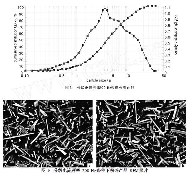 流化床式氣流粉碎( 200 Hz)產(chǎn)品平均粒徑為4.16μm,按我國粉體分類方法已經(jīng)成為超細粉體,針狀晶體形貌完好,而其它幾種方法的粉碎產(chǎn)品不同程度地出現(xiàn)過粉碎現(xiàn)象,不能很好地保護硅灰石的針狀晶體形貌。