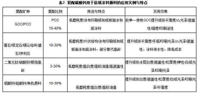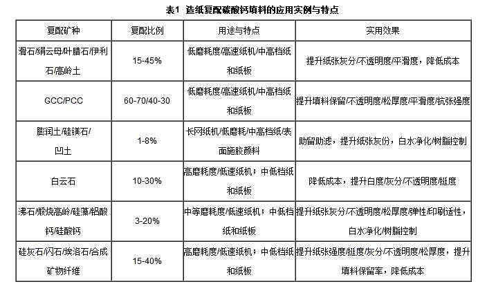 在一些具備資源條件地區(qū),利用不同礦物理化特性,相互取長(zhǎng)補(bǔ)短,利用方解石伴生礦種和較高白度的葉臘石、白云石、伊利石、透閃石、滑石、硅灰石、輕質(zhì)碳酸鈣等,與方解石混配制造復(fù)合型GCC產(chǎn)品的制造技術(shù)得到推廣。表1、表2列出了目前國(guó)內(nèi)已工業(yè)化的幾種碳酸鈣復(fù)配產(chǎn)品的實(shí)例,以及產(chǎn)品特點(diǎn)和主要用途與實(shí)用效果。