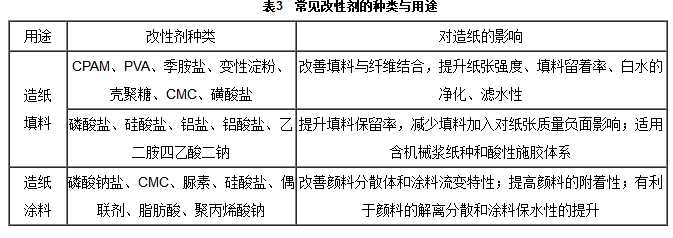 改性劑的正確選擇不僅要考慮活化劑與碳酸鈣及其復(fù)合粒子的親和性,同時(shí)要考慮助劑與紙漿中添加的其它化學(xué)助劑的相溶性;特別是用于涂料體系的改性鈣與常用涂料的膠料、輔料助劑的配伍效應(yīng)。目前國(guó)內(nèi)在研的化學(xué)改性造紙?zhí)妓徕}及對(duì)紙張性能的影響歸納于表3所示。