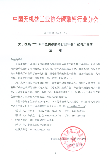 關(guān)于征集“2019年全國(guó)碳酸鈣行業(yè)年會(huì)”宣傳廣告的通知