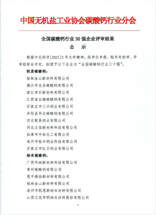 全國碳酸鈣行業(yè)30強(qiáng)企業(yè)評審結(jié)果 公示