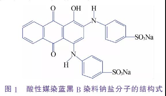 納米碳酸鈣作為一種新型高檔功能性填料用途相當(dāng)廣泛,但納米碳酸鈣作為一種白色粉末,應(yīng)用于塑料、橡膠等有機(jī)高分子材料領(lǐng)域時(shí),需要在干法混煉過(guò)程中添加各種染料或顏料才能制得各種彩色制品。干法混煉過(guò)程中添加的碳酸鈣只能是普通輕質(zhì)碳酸鈣或重質(zhì)碳酸鈣,因?yàn)榧词挂淮卧W邮羌{米碳酸鈣,也因團(tuán)聚而不具備納米特性。以彩色塑料制品生產(chǎn)工藝為例,將塑料母粒、填料碳酸鈣、偶聯(lián)劑、染料、增塑劑等助劑按一定比例混配,在加熱的條件下于混煉機(jī)中制成。如果在納米碳酸鈣生產(chǎn)過(guò)程中就進(jìn)行濕法染色處理,制造出具有良好分散性的彩色納米碳酸鈣,那么在制造彩色塑料、彩色橡膠、彩色紙張等彩色制品時(shí)就無(wú)需臨時(shí)做染色處理,有效地避免了干法混煉過(guò)程中納米碳酸鈣的團(tuán)聚問(wèn)題,發(fā)揮了納米碳酸鈣的納米性能,提高了各種高檔彩色制品的性價(jià)比。 1. 納米碳酸鈣的濕法染色機(jī)理分析 納米碳酸鈣作為一種無(wú)機(jī)納米粉體,其濕法染色機(jī)理既不同于木材、絲綢、化纖、頭發(fā)等物質(zhì)的濕法染色機(jī)理,也不同于常規(guī)粉體的干法染色機(jī)理。納米碳酸鈣的濕法染色機(jī)理必須從染色劑分子與碳酸鈣分子之間的化學(xué)機(jī)理方面加以分析。 1.1 濕法染色機(jī)理分析 彩色納米碳酸鈣的表觀性能必須具備長(zhǎng)置空氣中不褪色,長(zhǎng)時(shí)間放置在水中不掉色、不下沉,添加到塑料、橡膠、紙張等有機(jī)高分子材料中時(shí)具有良好的分散性能和納米特性。由于碳酸鈣顯弱堿性(pH為8~10),因此在選擇染色劑時(shí)以酸性染色劑為宜,二者才可能具有良好的結(jié)合性能。實(shí)驗(yàn)以酸性媒染藍(lán)黑B染料為例,其化學(xué)分子式為C26H13O2(NH)2OH(SO3)2Na2,其結(jié)構(gòu)式如圖1所示。