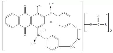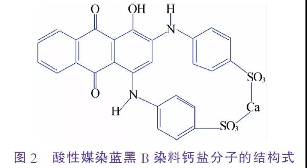 按Wiff發(fā)色基團(tuán)學(xué)說(shuō),染料的顏色取決于其分子結(jié)構(gòu)。醌式環(huán)是酸性媒染藍(lán)黑B染料的發(fā)色基團(tuán),分子中—OH、—SO3H是酸性助色團(tuán),分子中—NHR是堿性助色團(tuán),該染料分子結(jié)構(gòu)中共軛鏈很長(zhǎng)、加上苯環(huán)數(shù)量達(dá)5個(gè)之多、分子量大(518.8), 特別是助色基團(tuán)多,顏色得以加深。該酸性染料易溶于水,碳酸鈣漿液中游離的Ca2+與染色劑分子之間發(fā)生如下反應(yīng):