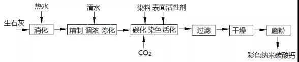 圖3 酸性媒染藍(lán)黑B染料鈣鹽分子與硬酯酸分子結(jié)合后的結(jié)構(gòu)式 2. 研制過(guò)程與檢測(cè) 2.1 研制工藝流程 圖4為彩色納米碳酸鈣制備的中試裝置工藝流程[8]。以工業(yè)石灰為主要原料,輔之各種顏色的酸性染色劑(100%)、硬酯酸(分析純)、氫氧化鈉(分析純)、工業(yè)鋼瓶CO2氣體,研制出了各種顏色的納米碳酸鈣產(chǎn)品。用PHS-3C型酸度計(jì)跟蹤碳化過(guò)程,用LS-608型激光粒度儀表征粒子的分布情況。