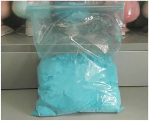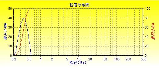 圖7 藍(lán)色納米碳酸鈣 圖8為彩色納米碳酸鈣的粒度分布圖。由圖8可見(jiàn),產(chǎn)品的D50約為350 nm,具有粒度分布均勻、分布范圍窄等特點(diǎn)。