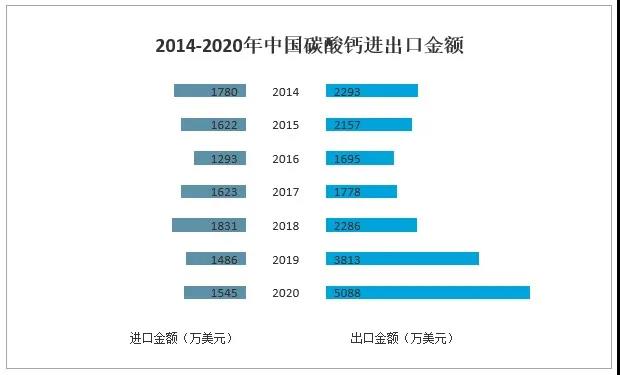 據(jù)中國(guó)海關(guān)數(shù)據(jù),2020年中國(guó)碳酸鈣進(jìn)口金額為1545萬(wàn)美元,同比增長(zhǎng)3.9%;中國(guó)碳酸鈣出口金額為5088萬(wàn)美元,同比增長(zhǎng)33.5%。