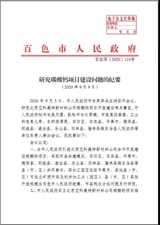 從地理位置來看,平果東距廣西省首府南寧市86公里,西距百色市113公里。百色市礦產(chǎn)資源豐富,有效碳酸鈣采礦權(quán)121個(gè),保有碳酸鈣資源約16億噸,正常投產(chǎn)后,可達(dá)約6800萬噸/年。 2020年9月3日,時(shí)任百色市人民政府市長周異決(現(xiàn)任市委書記)主持召開會(huì)議,會(huì)議決定,由市人民政府引進(jìn)艾科美特新材料有限公司合作開發(fā)建設(shè)碳酸鈣項(xiàng)目,采取市縣共建模式,深加工園區(qū)設(shè)在平果市。另外,百色市全部碳酸鈣資源集中到平果市進(jìn)行深加工。