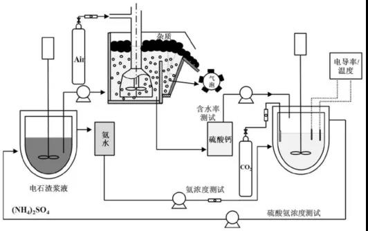 摘要:本發(fā)明公開了一種CO2礦化電石渣制備納米球霰石碳酸鈣方法:電石渣中鈣組分的浸?。簩㈦娛c硫酸銨溶液混合,攪拌反應(yīng)過濾得到含鈣中間產(chǎn)物和濾液;含鈣中間產(chǎn)物浮選除雜:將含鈣中間產(chǎn)物加水和混合后添加浮選劑進(jìn)行浮選,浮選后的含鈣產(chǎn)物經(jīng)過濾得到固相二水硫酸鈣;碳化反應(yīng):將二水硫酸鈣加水充分?jǐn)嚢杌旌系玫胶}漿體,將濾液加入含鈣漿體中并同時(shí)通入CO2氣體碳化得到碳酸鈣產(chǎn)物,再加入分散劑繼續(xù)攪拌后繼續(xù)通氣終止碳化反應(yīng),進(jìn)行固液相分離得到納米球霰石型碳酸鈣。該方法以硫酸銨作為電石渣浸取劑通過分步式溫和礦化工藝來獲取納米球霰石碳酸鈣的方法,可以得到純度及白度較高的納米球霰石型碳酸鈣。