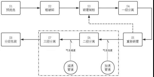 摘要:本發(fā)明公開了一種多級(jí)分離自控速式重質(zhì)碳酸鈣的制備工藝,屬于碳酸鈣制備領(lǐng)域,一種多級(jí)分離自控速式重質(zhì)碳酸鈣的制備工藝,包括如下步驟:預(yù)挑選;粗破碎;研磨制粉;一級(jí)分離;重新研磨;二級(jí)分離;三級(jí)分離;分級(jí)包裝,可以通過在進(jìn)行相對(duì)應(yīng)級(jí)別分離前,通過加速管道和減速管道對(duì)氣流的速度進(jìn)行調(diào)節(jié),有效保證重質(zhì)碳酸鈣分離的效果,對(duì)分離設(shè)備進(jìn)行保護(hù),進(jìn)而使得重質(zhì)碳酸鈣能夠正常制備,提高制備質(zhì)量,并且能夠有效省去后續(xù)分離過程增氣提速的步驟,在減少外部氣流對(duì)分離設(shè)備內(nèi)部氣流進(jìn)行沖擊和影響的同時(shí),有效節(jié)省壓縮機(jī)的投入和能量損耗,降低重質(zhì)碳酸鈣的制備成本,提高其的經(jīng)濟(jì)效益。