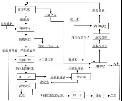 摘要:本發(fā)明涉及無機(jī)合成技術(shù)領(lǐng)域,公開一種循環(huán)制備納米碳酸鈣的工藝方法,本方法采用石灰石為原料,醋酸溶液為溶劑,兩者反應(yīng)制備醋酸鈣溶液和二氧化碳?xì)怏w,制得的醋酸鈣溶液與碳酸氫鉀溶液合成納米碳酸鈣,液固分離后的溶液為醋酸鉀溶液,該溶液在通入二氧化碳的情況下用高沸點(diǎn)有機(jī)胺配制的有機(jī)相進(jìn)行萃取醋酸,萃余液即是碳酸氫鉀溶液,經(jīng)濃縮后用于合成,有機(jī)相通過負(fù)壓蒸發(fā)獲得醋酸溶液并使有機(jī)相再生;本發(fā)明除了消耗石灰石外,其他物質(zhì)基本上都是循環(huán)使用,消耗極少,濃縮碳酸氫鉀和蒸發(fā)醋酸的能耗相對(duì)傳統(tǒng)的合成法也大大減少,所以本方法實(shí)現(xiàn)了在低能耗、低消耗的生產(chǎn)條件下生產(chǎn)納米碳酸鈣,同時(shí)原料成本低、整體工藝成本也低,實(shí)現(xiàn)了綠色環(huán)保地生產(chǎn)納米碳酸鈣。