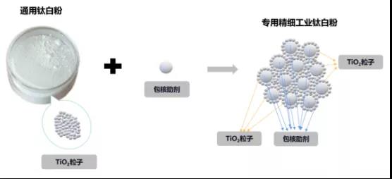 再者,針對(duì)研發(fā)、滿足需求。通常情況下,鈦白粉粒子以團(tuán)聚的形式存在,鈦白粉的光學(xué)性質(zhì)和顏料性能的利用,僅僅是表層的鈦白粉粒子,大部分內(nèi)部的鈦白粉粒子并未得以充分利用。通過(guò)采用包核助劑實(shí)現(xiàn)替代內(nèi)部的鈦白粉粒子,并且可以根據(jù)下游不同行業(yè)客戶對(duì)鈦白粉的粒徑、粒度、白度、消色力、遮蓋力、耐候性等性能的不同需求,研發(fā)不同種類的包核助劑。