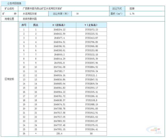 該項(xiàng)目名稱為廣西象州縣馬弄山礦區(qū)水泥用石灰?guī)r礦,礦區(qū)位于廣西來(lái)賓市象州縣,礦區(qū)面積1.76平方千米。
