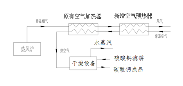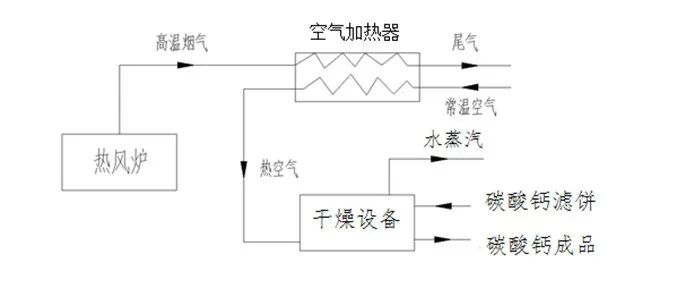 某市納米碳酸鈣生產(chǎn)企業(yè)年產(chǎn)納米碳酸鈣系列產(chǎn)品6萬噸。在納米碳酸鈣生產(chǎn)流程中,涉及到脫水干燥工藝,需要在干燥設(shè)備中利用熱空氣烘干壓濾機脫水后的碳酸鈣濾餅。熱風(fēng)爐燃煤產(chǎn)生高溫?zé)煔夂?,再加熱常溫下的干凈空氣,產(chǎn)生符合烘干工藝要求的熱空氣,相關(guān)的簡易工藝流程如圖1所示。