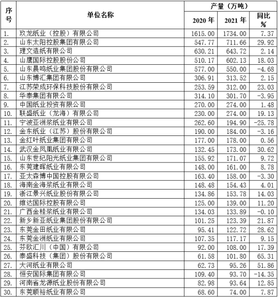 2021年重點(diǎn)造紙企業(yè)產(chǎn)量前30名企業(yè)