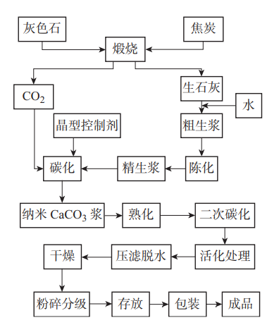 生產(chǎn)工序包括:將石灰進(jìn)行煅燒、消化、過濾、冷卻、一次碳化、陳化、二次碳化、表面處理、壓濾脫水、干燥、粉碎等。成品為立方體,一次粒徑為20~30nm,平均粒徑為220nm左右。