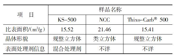 本次實(shí)驗(yàn)選用的納米碳酸鈣有3種,分別為自制的KS-500、國(guó)內(nèi)某碳酸鈣廠家專(zhuān)為聚氨酯領(lǐng)域定制生產(chǎn)的NCC、美國(guó)特礦的Thixo-Carb® 500,具體粉體參數(shù)對(duì)比如表1所示。