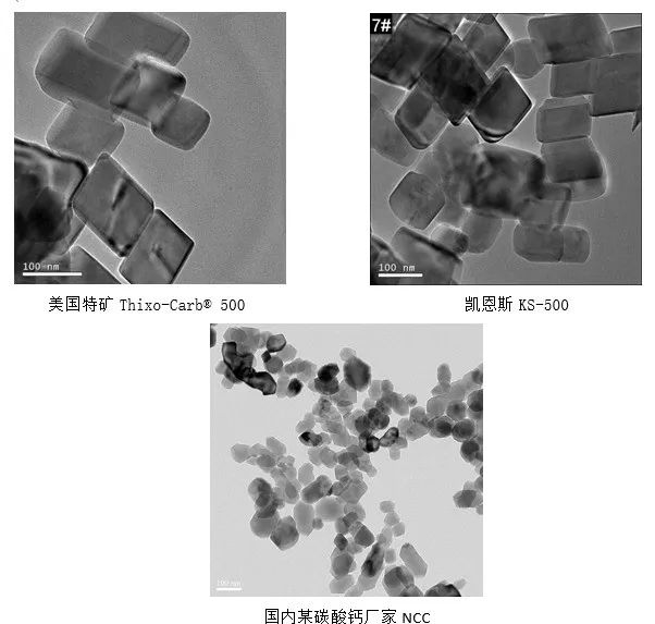 KS-500產(chǎn)品的改性機(jī)理如圖1所示,其與Thixo-Carb® 500、NCC的晶體形貌對(duì)比見(jiàn)圖2。可以發(fā)現(xiàn),Thixo-Carb® 500和KS-500均為規(guī)整大立方體,平均粒徑超過(guò)100 nm;而NCC產(chǎn)品平均粒徑則在60~70 nm左右,形貌規(guī)整度較差。
