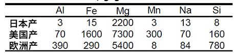 日本產(chǎn)、美國(guó)產(chǎn)和歐洲產(chǎn)的石灰石中的雜質(zhì)含量比率測(cè)量結(jié)果示例(μg/g)