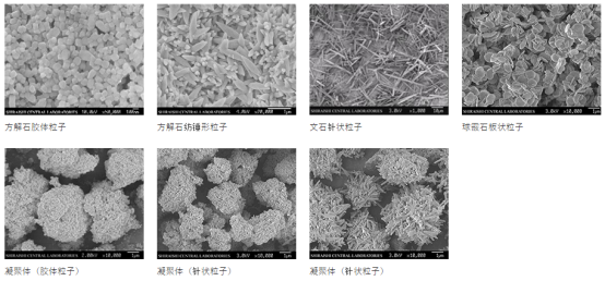 通過(guò)以上二種碳化方式的組合,可以制備無(wú)定形、立方體、柱形、紡錘形、片狀、球形、針狀等50多種不同晶形和大小的碳酸鈣,粒徑在20-5000nm可調(diào)。