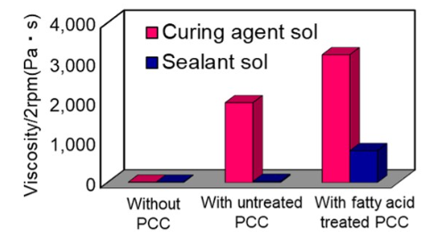 上圖是雙組份聚氨酯膠的粘度變化,從圖左邊開始分別為未混合PCC、混合了未處理PCC以及混合了經(jīng)過(guò)脂肪酸處理后的PCC的膠劑??梢钥闯觯褂弥舅岣淖儽砻嫘再|(zhì)后,可以提高密封膠作業(yè)的效率。