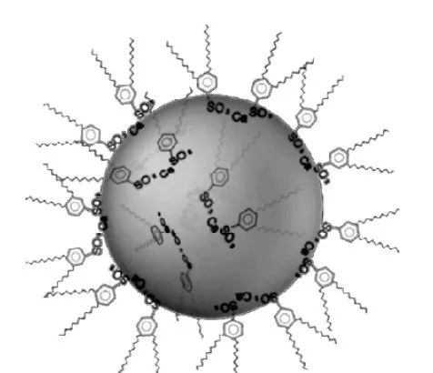 一般認為堿性金屬清凈劑的有效部分由穩(wěn)定的載荷膠團和游離的表面活性劑分子及其膠束組成。該載荷膠團由碳酸鹽(含鎂、鈣、鈉等,質(zhì)量分數(shù)15 %~40 %)及吸附在表面的表面活性劑(質(zhì)量分數(shù)20%~45 %)組成有效組分以膠體體系穩(wěn)定分散于油品中,其結(jié)構(gòu)如圖1 所示。