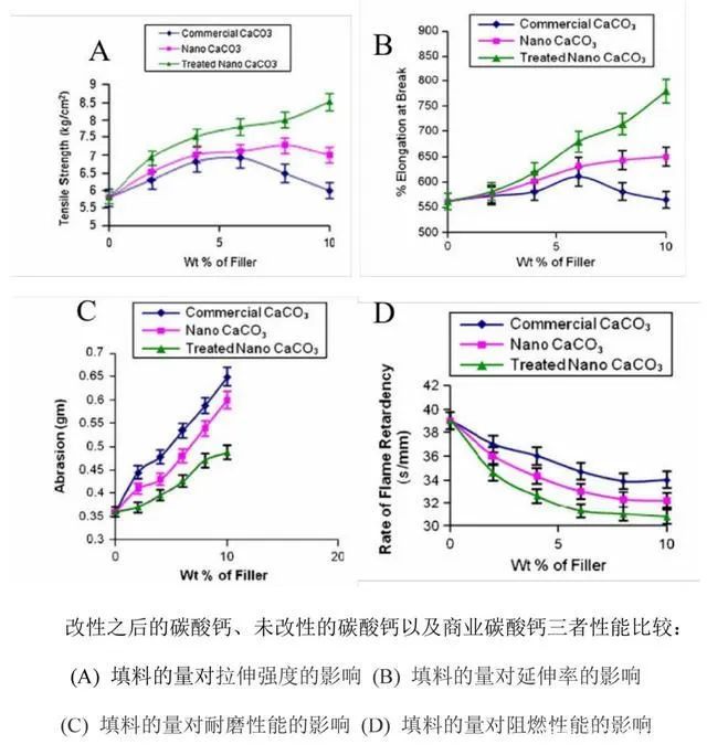Satyendra Mishra等研究了硬脂酸改性之后的納米碳酸鈣對(duì)硅樹脂復(fù)合材料性能的影響。在十二烷基磺酸鈉存在下,他們采用一定濃度的CaCl2和NH4HCO3發(fā)生反應(yīng),過濾干燥得到納米碳酸鈣粉末。然后在甲苯存在下,一定量的硬脂酸和納米碳酸鈣攪拌混合,分別得到不同硬脂酸濃度的表面改性納米碳酸鈣,然后加入硅樹脂中作為填料,改善其性能,得到改性納米復(fù)合材料。結(jié)果表明,表面改性之后的納米碳酸鈣相比未改性的納米碳酸鈣和商業(yè)碳酸鈣,能夠極大的提高復(fù)合材料的拉伸強(qiáng)度、延伸率和耐磨性能以及阻燃性能。表面改性也能產(chǎn)生強(qiáng)粘合力,這使得聚合物鏈更牢固,聚合物的熱穩(wěn)定提高。基于這些納米復(fù)合材料的高強(qiáng)度高韌性,可以用于電纜連接器、電氣和照明開關(guān)設(shè)備,在航空航天領(lǐng)域也有重要價(jià)值。