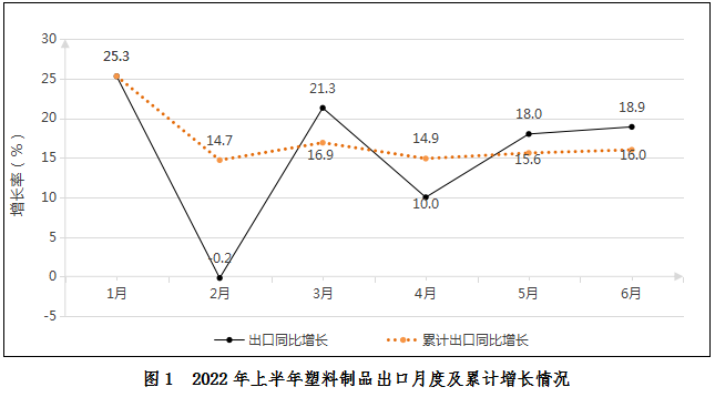上半年,塑料制品外貿(mào)出口展現(xiàn)出較強(qiáng)的韌性,為全年外貿(mào)穩(wěn)步發(fā)展打下了堅實的基礎(chǔ)。據(jù)海關(guān)總署數(shù)據(jù),塑料制品累計出口額524.4億美元,同比增長16.0%,高于輕工業(yè)出口和全國貨物貿(mào)易出口11.98%和14.2%的增長率,出口額占輕工商品累計出口額的11.4%。一季度平穩(wěn)開局,5、6月份迅速扭轉(zhuǎn)了4月份增速下滑的趨勢,隨著國內(nèi)疫情防控形勢總體向好,各項穩(wěn)增長政策效應(yīng)逐漸顯現(xiàn),塑料制品外貿(mào)企業(yè)復(fù)工復(fù)產(chǎn)有序推進(jìn),特別是長三角等地區(qū)進(jìn)出口快速恢復(fù),帶動全國外貿(mào)整體增速明顯回升。5月份出口同比增長18%,增速較4月份加快了8個百分點,6月份增速進(jìn)一步提升為18.9%。具體情況詳見圖1。