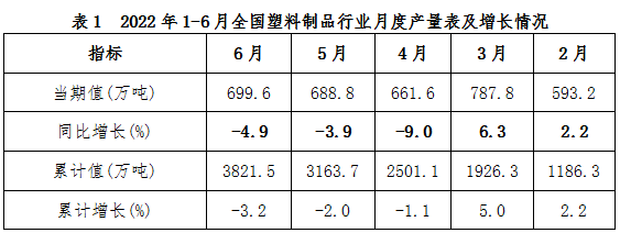 一季度,我國社會經(jīng)濟(jì)發(fā)展平穩(wěn)有序,到二季度受多重因素影響,經(jīng)濟(jì)下行壓力急劇增大。為此,國家加大宏觀政策調(diào)節(jié)力度,有效實施穩(wěn)經(jīng)濟(jì)一攬子政策措施,使疫情反彈得到有效控制,國民經(jīng)濟(jì)企穩(wěn)回升,社會大局保持穩(wěn)定。塑料加工行業(yè)上半年發(fā)展與社會經(jīng)濟(jì)保持同頻,整體呈現(xiàn)平穩(wěn)運行-下行探底-逐步恢復(fù)走勢。上半年全國塑料制品行業(yè)月度產(chǎn)量及增長情況詳見表1。