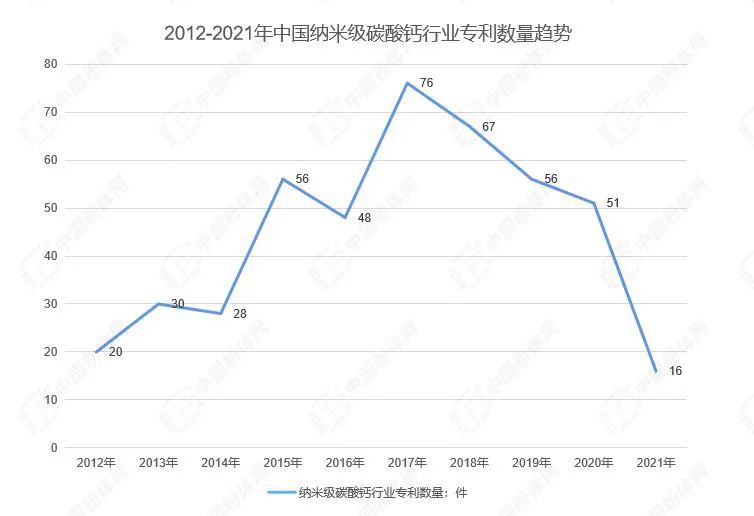 2012-2021年中國納米級碳酸鈣行業(yè)專利數(shù)量趨勢