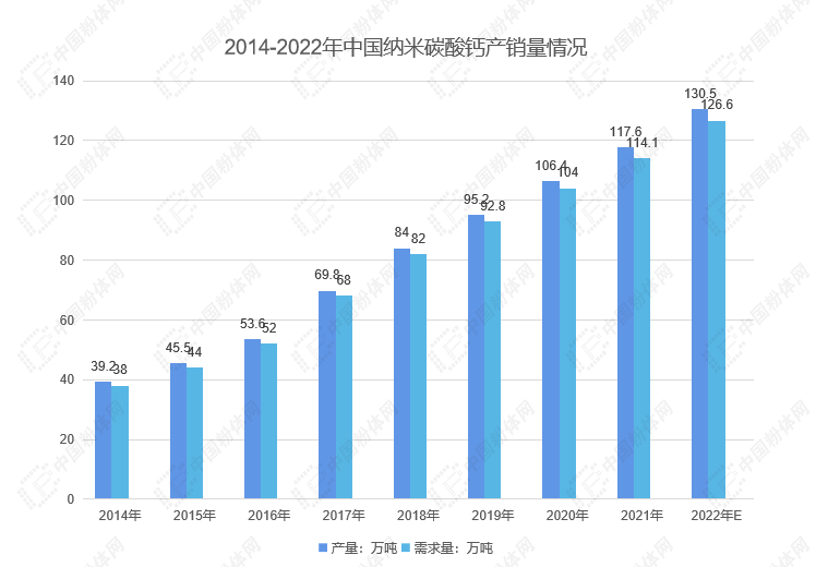 隨著下游行業(yè)生產(chǎn)技術(shù)與理論的不斷發(fā)展,碳酸鈣已由原來單純的填充劑變?yōu)橐环N新型的功能性填充材料,應(yīng)用領(lǐng)域不斷拓展,其填充的比例也越來越高。近幾年,我國納米級碳酸鈣行業(yè)市場快速增長,產(chǎn)銷規(guī)模呈增長趨勢,預(yù)計2022年我國納米級碳酸鈣行業(yè)產(chǎn)量有望達到130.5萬噸,需求量有望達到126.6萬噸。