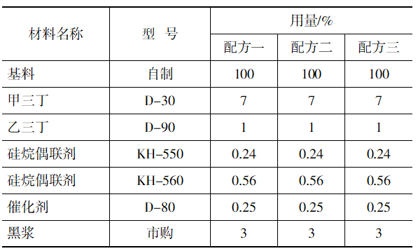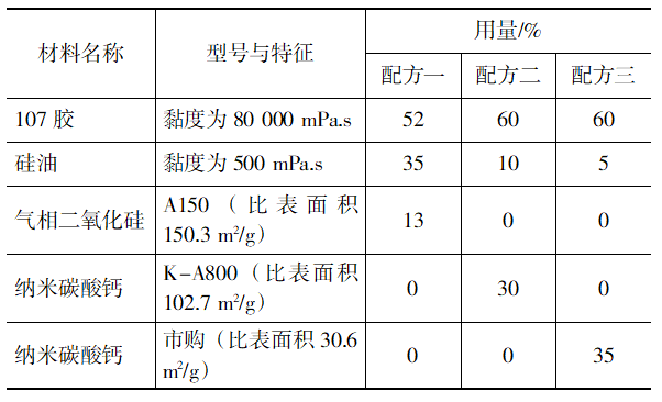 根據(jù)粉體的不同性質(zhì),設(shè)計(jì)了3種不同的應(yīng)用配方,以考察納米碳酸鈣K-A800和常規(guī)納米碳酸鈣在亮黑硅酮密封膠中替代氣相二氧化硅的可行性。其中,基料的配方見(jiàn)表3,硅酮密封膠的配方見(jiàn)表4,性能檢測(cè)結(jié)果見(jiàn)表5。